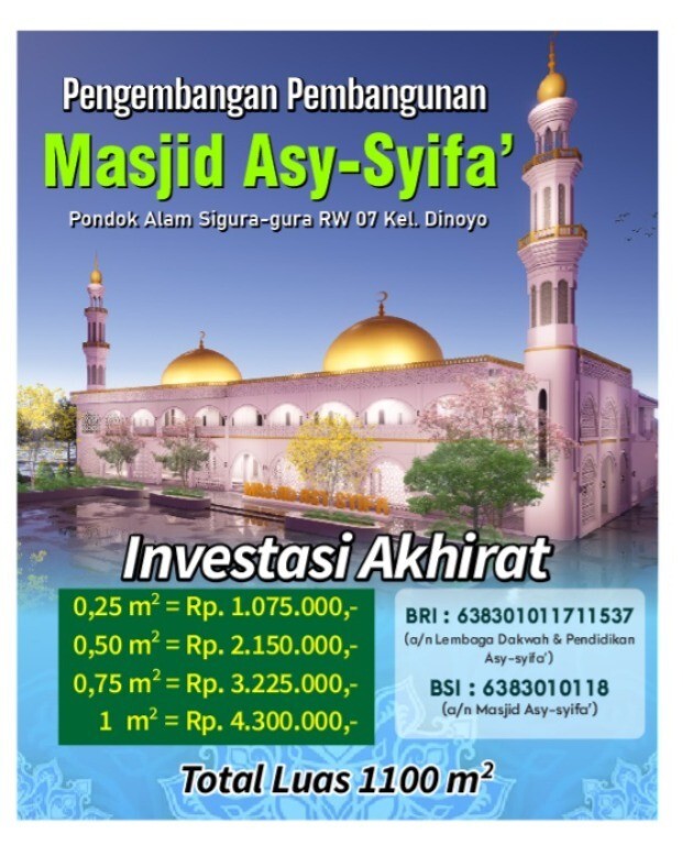 Masjid Asy-Syifa’ yang berlokasi di Perum Pondok Alam Sigura-gura B4/15 RT 02 RW 07 Kelurahan Dinoyo Kecamatan Lowokwaru Kota Malang, selain tempat peribadatan juga berfungsi sebagai :